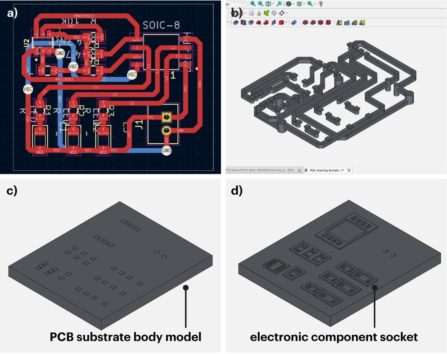 研究团队开发的FreeCAD插件能够自动将KiCad电路板设计转换为3D可打印模型,并智能集成通孔和表面贴装元件插座。这种增材制造工艺不仅支持复杂的3D电路拓扑,还能制作使用焦耳热变形的自适应器件,如一款可自主弯曲的夹持器,展示了技术的巨大潜力。
