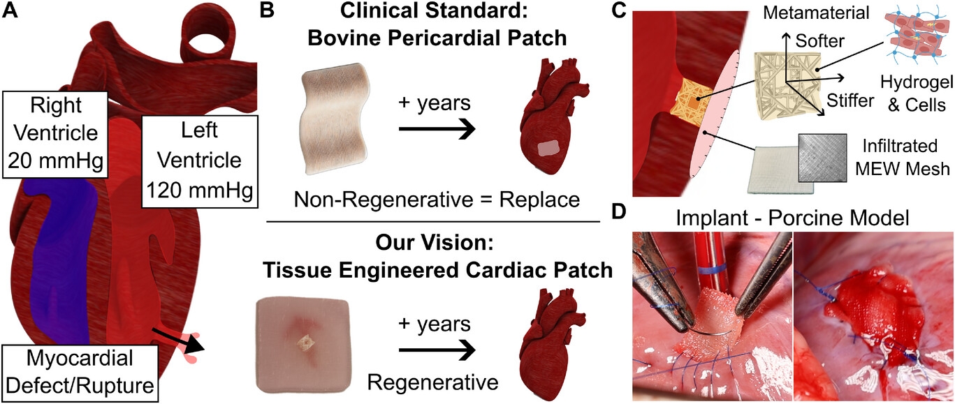 心脏病发作后,心脏局部供血中断,导致心肌缺氧坏死,严重时甚至引发心壁破裂,需紧急手术修复。目前临床常用的牛心包补片(BPP)虽具备良好稳定性和渗透性,但因它的生物惰性,长期植入后易引发钙化、血栓及炎症等并发症,且无法与心脏组织整合。针对现有补片的局限,研究团队在Robert Katzschmann教授与Omer