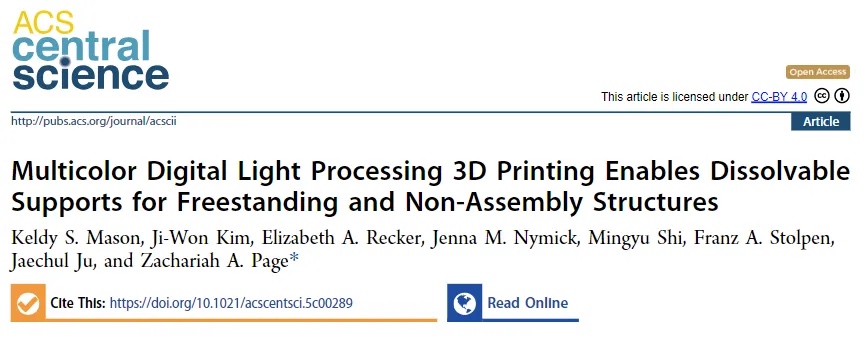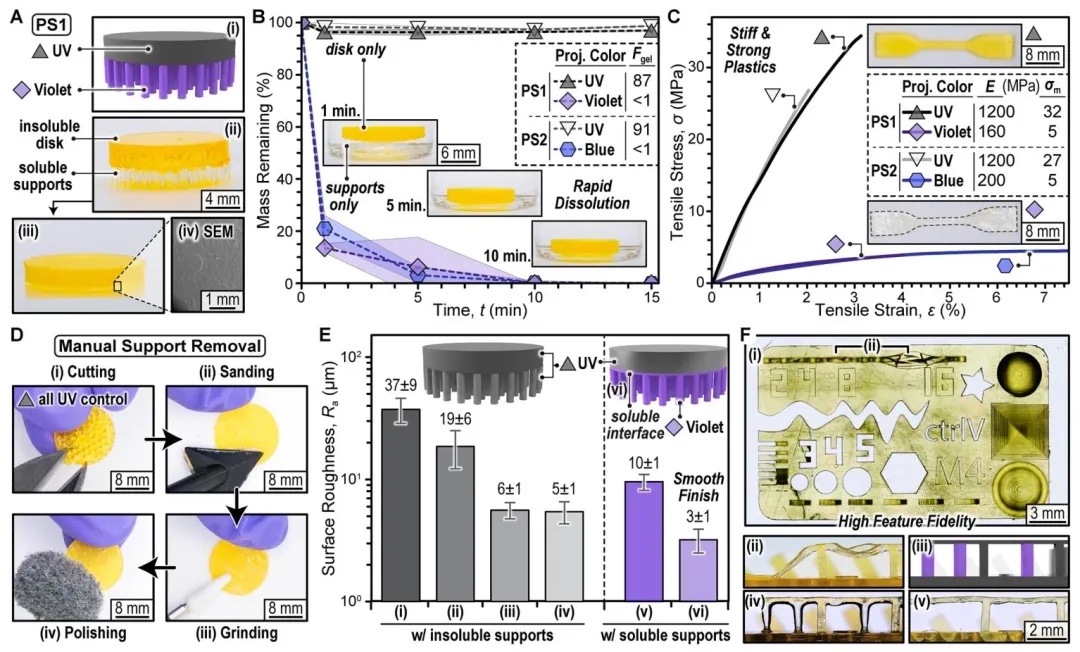 Page教授团队开发了新型多色光响应树脂体系,通过紫外光(UV)和可见光(紫色或蓝色)的选择性照射,分别生成不溶性热固性材料(作为结构主体)和可溶性热塑性材料(作为支撑)。该团队利用丙烯酸酯和环氧基树脂的协同反应,结合微流控技术构建了可溶解支撑体系,实现了在环保溶剂乙酸乙酯中10分钟内快速溶解支撑结构,且表面精度优于传统手动处理。实验验证了该技术在打印钩子、链环、关节等复杂结构中的可行性,显著提升了DLP打印的几何适应性和生产效率。