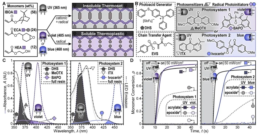 nm)仅引发丙烯酸酯聚合,生成可溶性热塑性材料(分子量约11 kDa),两者在光谱响应与化学交联机制上具有显著选择性。