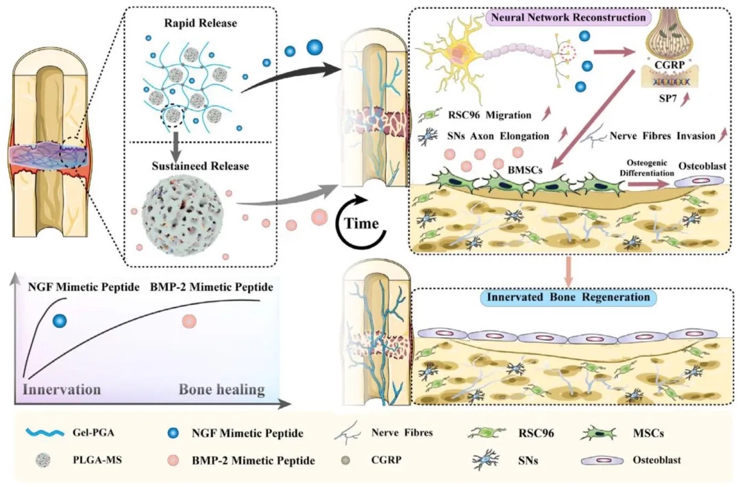 来自中山大学深圳校区生物医学工程学院的张超教授团队与南方医科大学材料研究中心的廖立琼教授团队合作,设计并构建了一种3D打印微球-水凝胶支架,通过聚乳酸-羟基乙酸共聚物(PLGA)微球包封BMP-2模拟肽、水凝胶基质负载NGF模拟肽,实现了NGF模拟肽的快速释放和BMP-2模拟肽的长期缓释。该支架通过可编程释放生长因子模拟肽,促进神经网络重建和骨再生,并深入探究了神经-骨串扰的分子机制。相关工作以“3D
