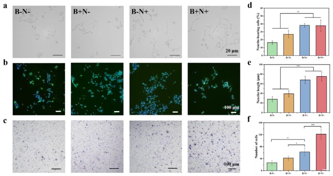 通过PC12细胞(肾上腺嗜铬细胞瘤细胞)神经突分化染色、RSC96细胞(施万细胞)Transwell迁移实验及免疫荧光定量分析,研究了支架提取物对神经细胞的作用。结果显示,含NGF模拟肽的B-N+和B+N+组诱导PC12细胞形成长轴突(神经突长度显著增加),神经突阳性细胞比例提升;B+N+组RSC96细胞迁移数量最多,证实NGF模拟肽快速释放可加速神经网络形成,BMP-2模拟肽亦有协同促进作用。