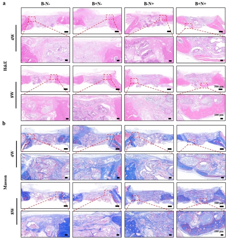 组织学与免疫荧光分析 通过H&E染色观察炎症反应、Masson染色评估胶原纤维生成及β-tubulin/OCN双标染色定位神经-骨界面,研究了支架的生物相容性和再生微环境。结果显示,各组均无明显炎症,B+N+组8周时可见大量成熟胶原纤维沿支架孔隙排列,β-tubulin阳性神经纤维密度最高,OCN阳性矿化区域覆盖缺损中心,验证了神经再支配对骨再生的引导作用。