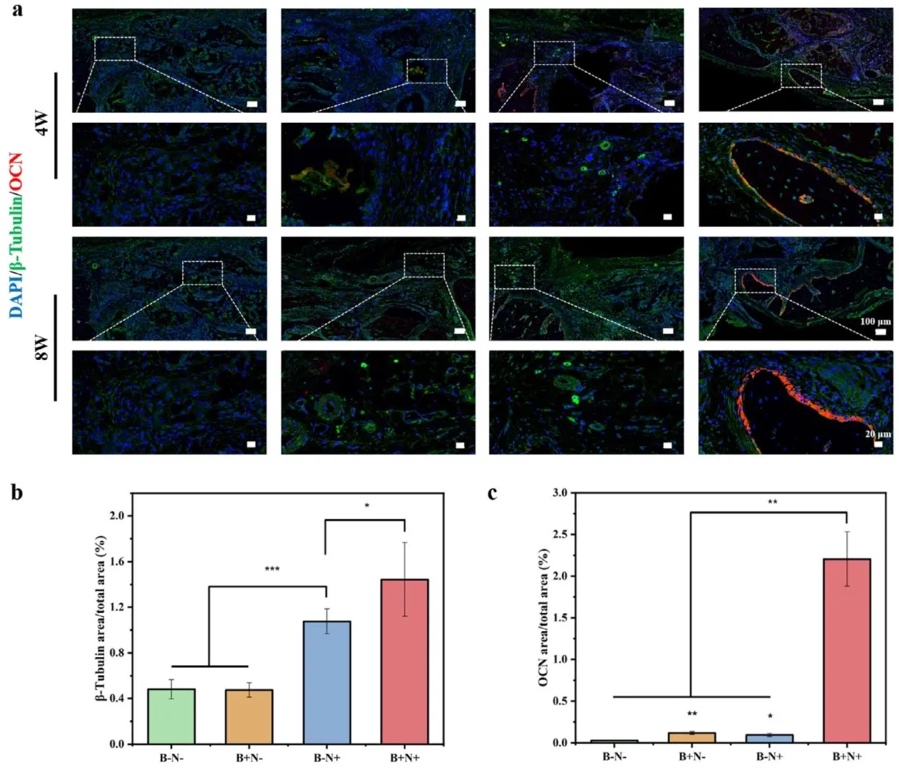 通过免疫荧光染色定量β-tubulin阳性神经区域和OCN阳性骨组织面积,研究了支架对神经-骨耦合的调控效果。结果表明,B+N+组β-tubulin阳性面积较对照组增加约2倍,OCN阳性面积提升3倍以上,证实NGF/BMP-2模拟肽共递送可同步增强神经纤维侵入和成骨活性,实现类生理条件下的骨愈合微环境重建。