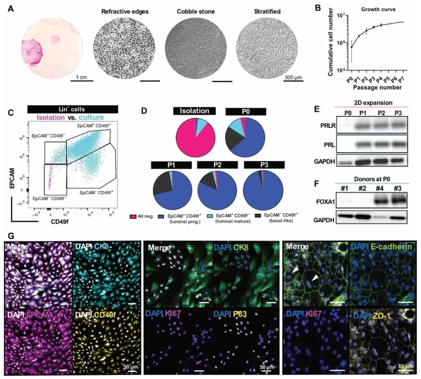 blot及免疫荧光染色等方法,研究了MECs在体外培养过程中的表型及功能变化。结果显示,乳汁MECs可扩增至少三代,保留上皮表型及催乳素受体(PRLR)表达,且能分泌催乳素,具备体外泌乳潜力。