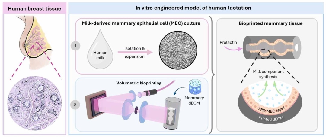 Zenobi-Wong教授团队,利用体积打印技术,将牛乳腺脱细胞外基质(dECM)制备成仿生支架,并结合人乳汁来源的乳腺上皮细胞(MECs),成功构建了支持MECs体外泌乳的三维模型,该模型可分泌β-酪蛋白和乳脂球,为研究泌乳调控因素提供了新平台。相关工作以“Volumetric