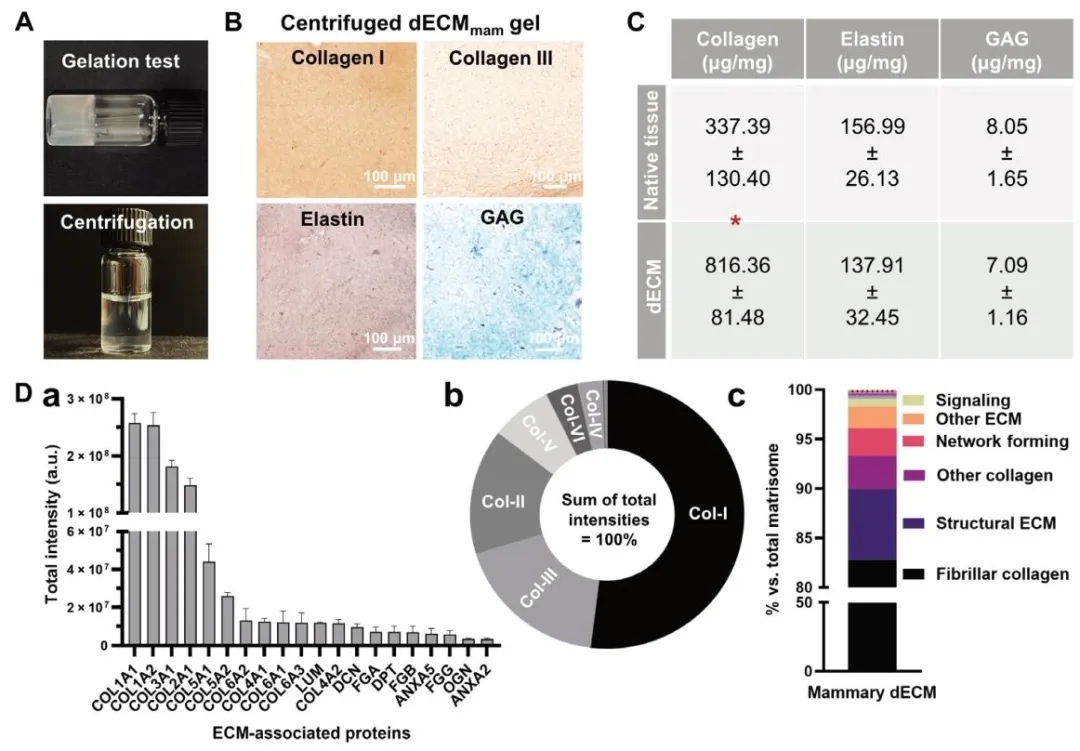 乳腺组织dECM用于光基打印的特性分析图,通过从泌乳期牛乳腺组织提取dECM,进行凝胶测试、组织学染色、蛋白质定量及蛋白质组学分析,研究了dECM的成分与生物活性。结果表明,dECM保留了胶原、弹性蛋白及糖胺聚糖等关键细胞外基质成分,经离心处理后可用于光基打印,为构建仿生支架提供了生物材料。