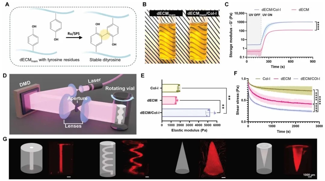 乳腺组织工程用dECMmam/Col-I的高分辨率体积打印图,通过采用钌/过硫酸钠(Ru/SPS)光引发体系,优化dECM与胶原I(Col-I)的配比,进行光流变学及机械性能测试,研究了打印支架的制备工艺与性能。结果显示,打印的dECMmam/Col-I结构分辨率达300