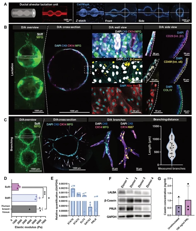 μm的肺泡样D/A单位,接种MECs后进行免疫荧光染色、RT-qPCR及ELISA检测,研究了MECs在打印支架上的泌乳能力。结果表明,MECs在支架上形成连续单层,分泌β-酪蛋白、乳脂球等乳成分,且材料刚度影响细胞分支行为,验证了模型在泌乳研究中的适用性。
