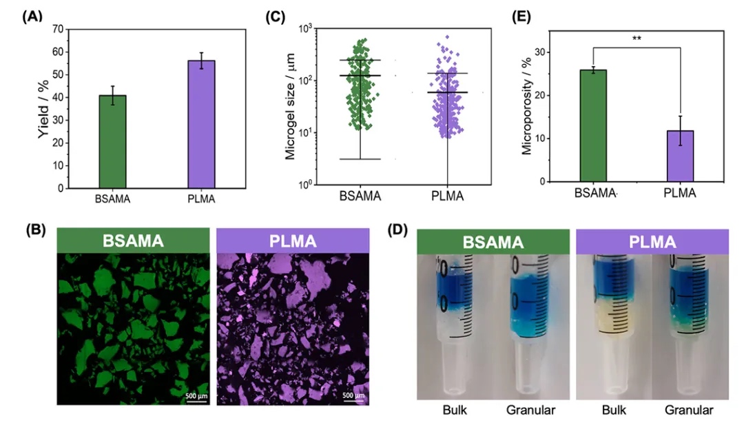 通过机械破碎法制备的BSAMA和PLMA基微凝胶的产量、形态、粒径分布以及孔隙率。结果显示,PLMA基微凝胶的产量更高,粒径更小且分布更广,而BSAMA基微凝胶的孔隙率更大。这些特性与微凝胶的尺寸和分布密切相关,为后续的3D打印和生物相容性研究提供了重要基础。