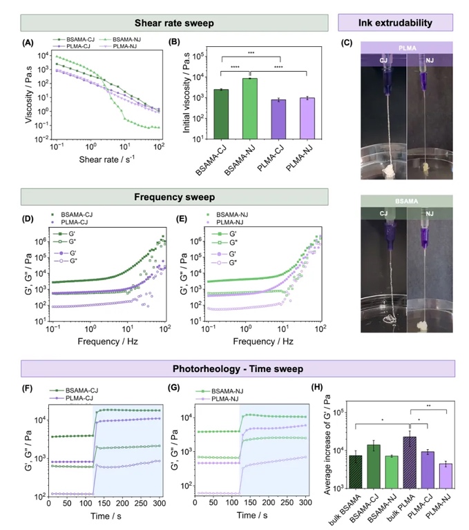 通过流变学测试全面评估了BSAMA和PLMA基颗粒化墨水的打印性能相关特性。结果显示,所有配方均展现出剪切变稀行为,适合挤出打印;喷嘴堵塞(NJ)处理的墨水比离心堵塞(CJ)处理的墨水具有更高的初始粘度和更好的挤出性能。光交联后,墨水的储存模量显著增加,表明交联过程有效提升了墨水的机械稳定性,为3D打印提供了理想的材料特性。