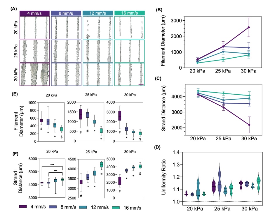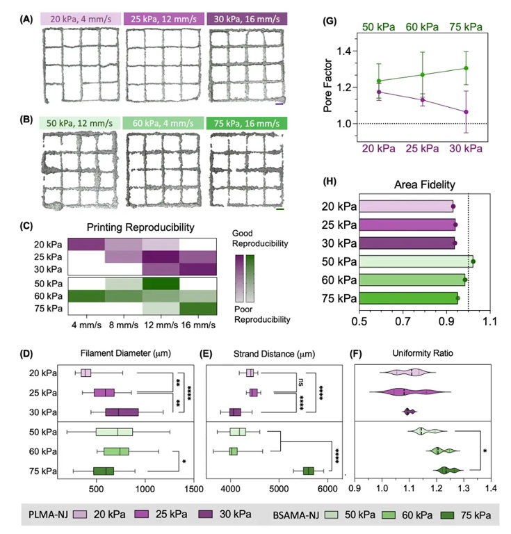 通过打印丝状物的显微照片和相关参数(如丝状物直径、间距和均匀性比率)分析,表明PLMA-NJ墨水在不同打印压力和速度下展现出良好的打印响应性和均匀性,尤其在25