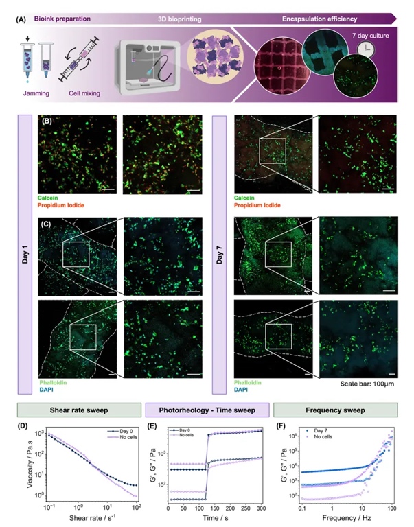 双重步骤策略:通过化学交联形成块状水凝胶,再进行机械破碎和堵塞处理,成功将低粘度的血源性蛋白质转化为适合3D打印的颗粒化墨水。这种方法不仅提高了材料的可打印性,还保留了其生物活性。