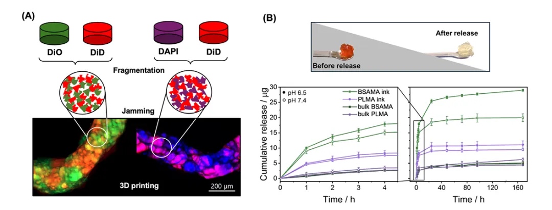 kPa,显著降低了细胞的剪切应力,提高了细胞的存活率和活性。打印后的结构通过光交联迅速固化,形成具有高机械稳定性和鲁棒性的支架,且光交联过程对细胞的毒性较小。PLMA基墨水在打印丝状物、网格和复杂结构时展现出极高的打印保真度和结构完整性,即使在没有支撑浴的情况下也能打印出多层结构和复杂几何形状。此外,颗粒化墨水具有模块化特性,可以通过混合不同荧光标记的微凝胶或封装不同的药物来实现多功能性。这项研究为利用天然血源性蛋白质制造生物活性和患者特异性的生物打印墨水提供了新的思路,进一步拓展了其在药物递送和组织工程中的应用潜力。