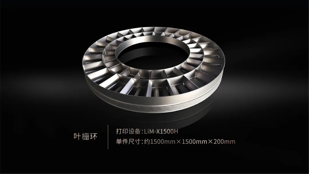 在延续LiM-X1500H优异性能的基础上,创造性地研发了LiM-X1500HF“飞行打印”设备,其制造的航天发动机关键零部件叶栅环,直径超1400mm,整体为复合叶轮结构,叶片数量多且薄,打印成品表面致密无缺陷、连接结构无焊缝焊点、整体均匀一致;零件外表面合理均布加强筋,提升整体强度与刚度;选用高温合金成形,进一步确保其在高温、高压、高速气流环境下性能稳定。