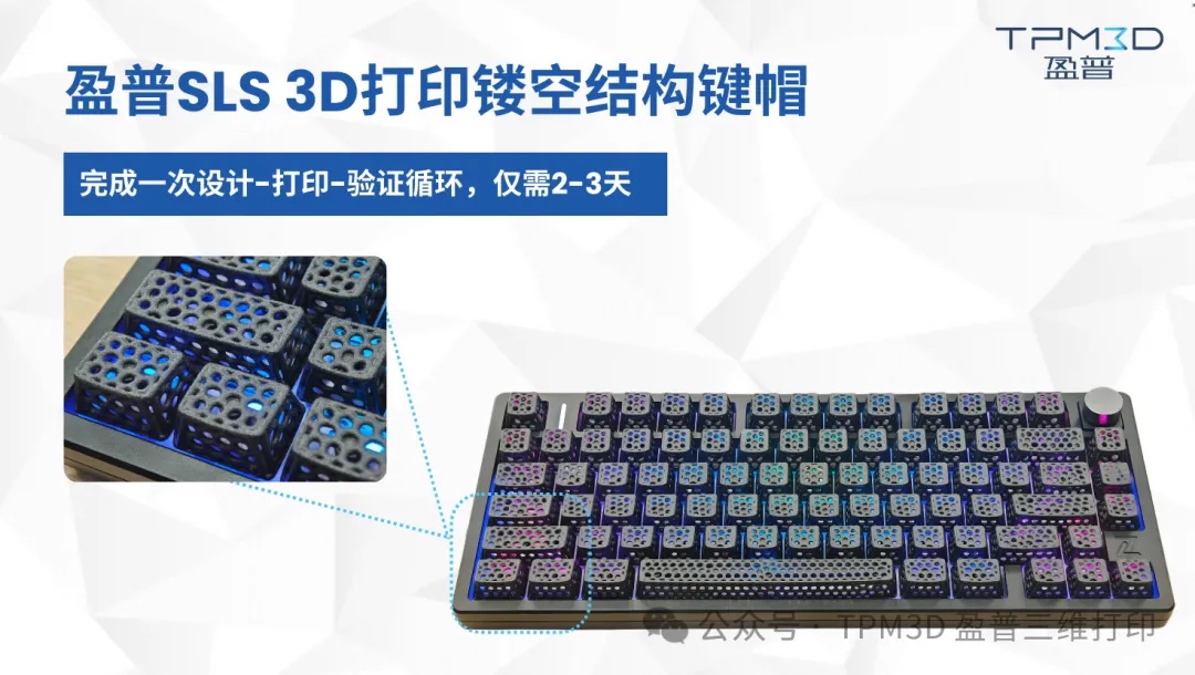 同时尼龙材料本身具有良好的强度和耐用性,成功验证了光影效果和耐用性,搭配化学整齐平滑后处理工艺,键帽表面光滑疏水且亲肤,可以作为实际产品使用。使用3D打印来进行设计迭代,仅需2-3天就可完成一次设计-打印-验证的循环,相比传统的即使非镂空设计键帽也要提高迭代速度近70%,大幅加速研发进度。