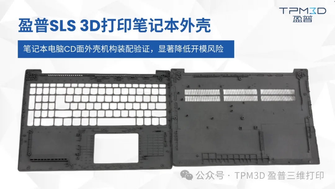 在笔记本电脑紧凑的C面(键盘面)和D面(底壳)设计中,涉及大量精密卡扣、螺丝柱、接口开孔以及内部加强筋布局。利用盈普SLS一次性打印出整个C/D面组件原型,工程师可进行真实的主板、电池、散热模组等关键部件的装配测试,提前发现并解决潜在的干涉、间隙不均、螺丝柱强度不足等问题,确保量产结构设计的可靠性,显著降低开模风险。