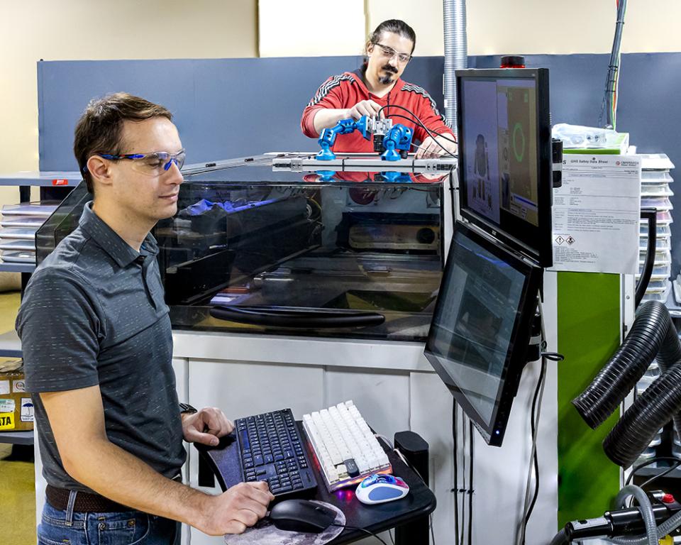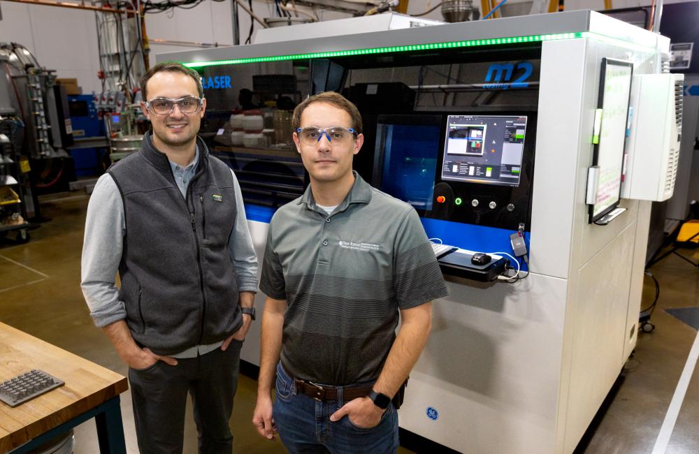 △ORNL研究人员Luke Scime和Zackary Snow使用Peregrine软件在3D打印过程中监控和分析组件。(图片来源:Genevieve Martin/ORNL,美国能源部)