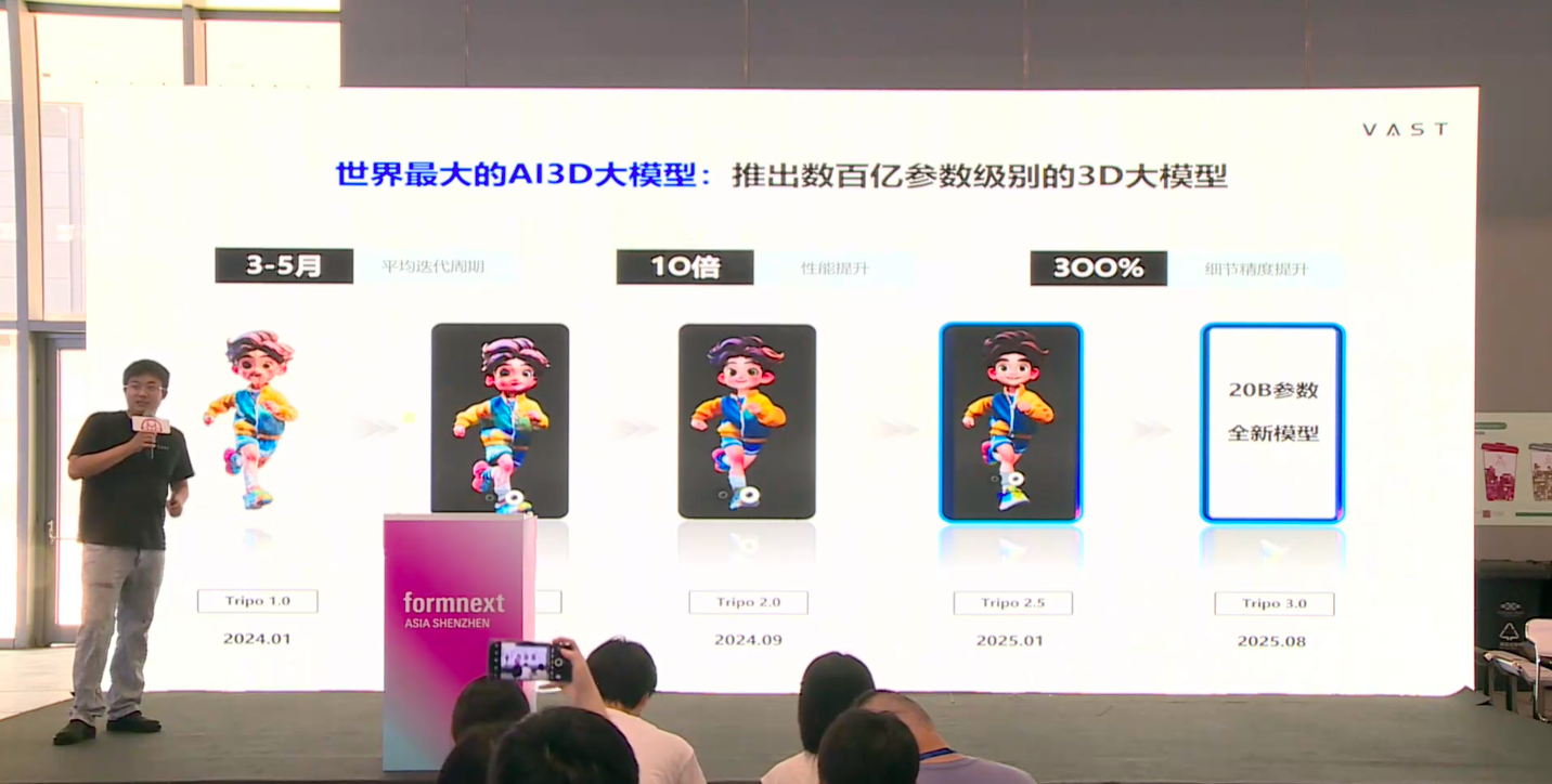 宋亚宸重点介绍了VAST的最新技术成果,Tripo 3.0大模型拥有200亿参数,是此前版本的十倍,也是目前全球最大的AI 3D生成模型之一,在几何细节与纹理表现上实现了显著提升。
