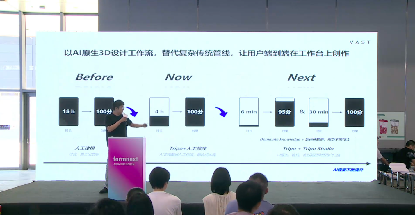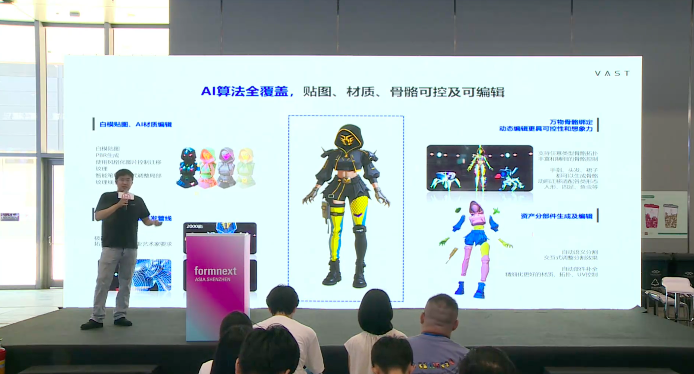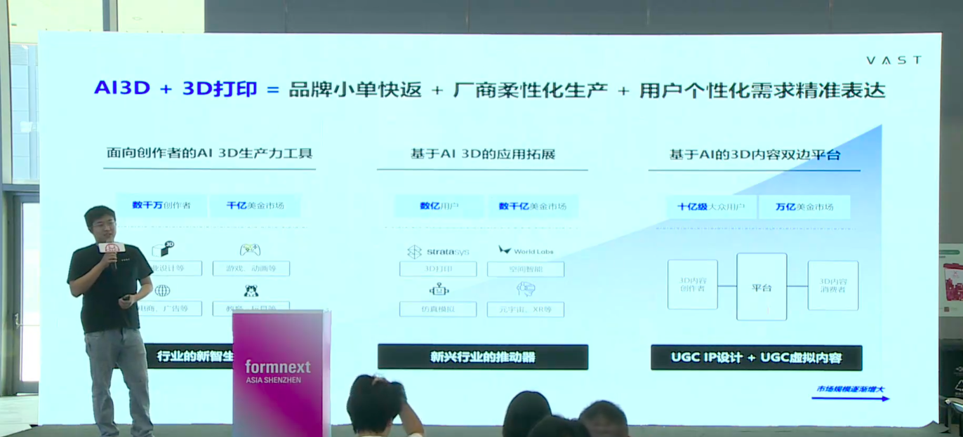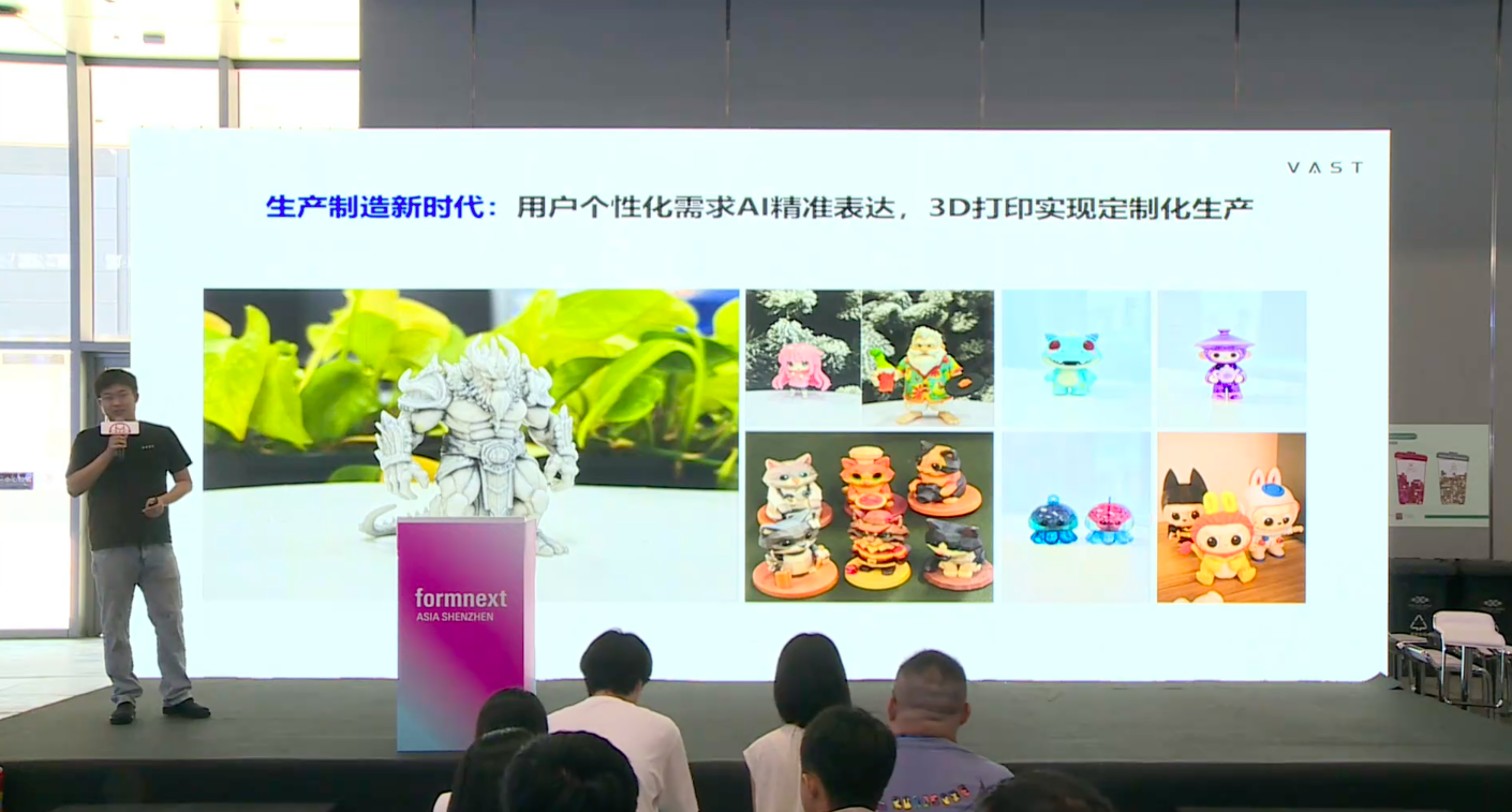 在2025年深圳Formnext展会上,VAST公司创始人兼CEO宋亚宸接受了南极熊3D打印网的邀请,在第二届3D打印农场大会做了《3D打印是AI新时代的生产制造方式》的报告,深入阐述了人工智能(AI)与3D打印技术结合如何彻底改变传统生产制造方式,并分享了其AI