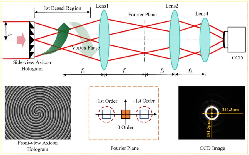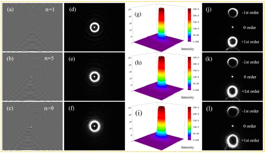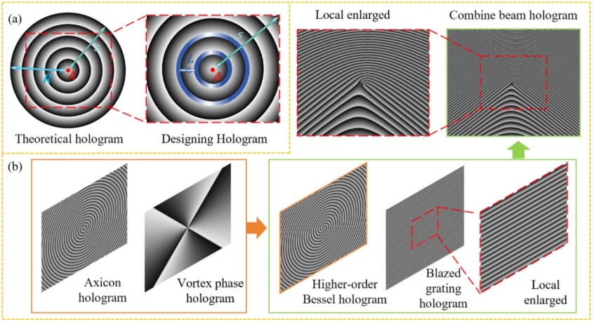 △(a)贝塞尔光束全息图计算原理;(b)涡旋相位与闪耀光栅相位叠加的全息图。图片来自《自然通讯》。