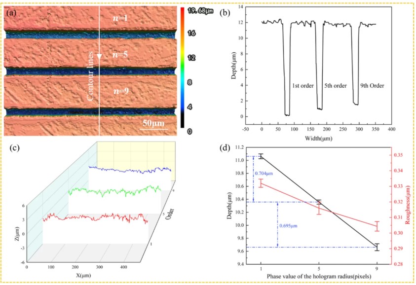 形侧壁并使微通道底部变得平滑。这种协同效应减少了热效应和热影响区。通过在整个加工区域更均匀地分配能量,组合光束可防止熔体飞溅,并通过受控的材料回流填充烧蚀凹坑。研究还评估了全息参数如何影响通道尺寸。将全息图的相位半径值(s)增加四个像素,通道宽度增加