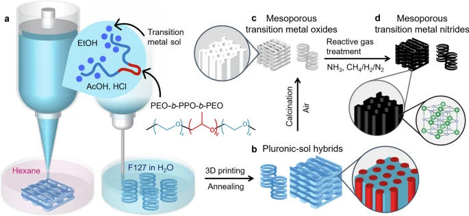 这项新研究利用一种在3D打印过程中自组装的共聚物-无机纳米颗粒墨水,增强了材料的性能;随后,通过热处理,打印材料转化为多孔晶体超导体。这种方法与传统的多孔材料3D打印方法截然不同,传统的多孔材料3D打印方法通常需要单独合成多孔材料,将它转化为粉末,与粘合剂混合,然后通过热处理进行再加工。