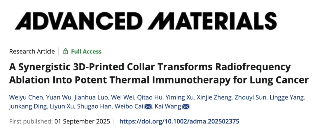 2025年9月,浙江大学医学院附属第四医院/浙江省肺癌精准诊疗重点实验室主任王凯教授团队在国际顶级材料科学期刊Advanced