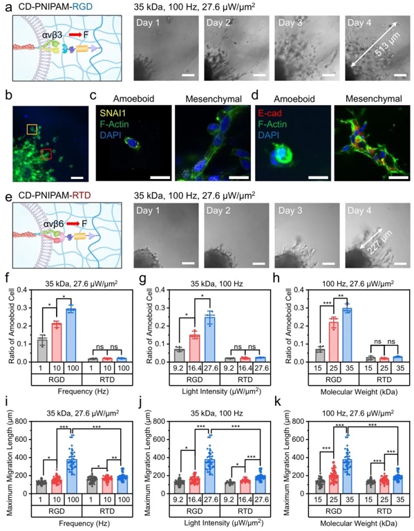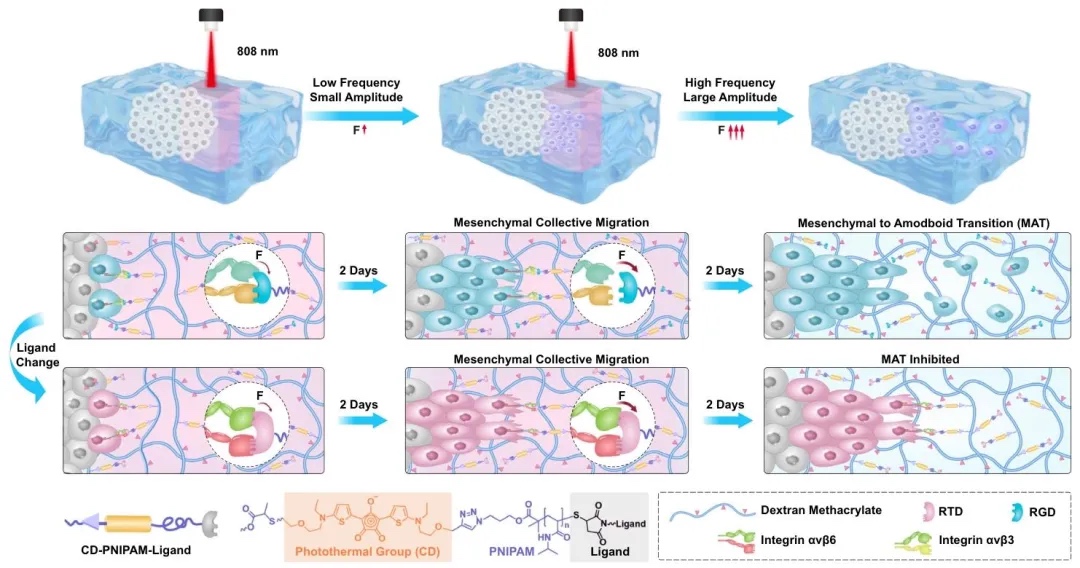 DexMA水凝胶平台的设计及其对癌细胞迁移的调控机制。结果表明,该平台利用近红外光照射使CD基团将光转化为热,促使温敏性PNIPAM链收缩并直接对细胞受体施加拉力,可通过不同配体(RGD和RTD)靶向整合素αvβ3和αvβ6,实现对癌细胞迁移的调控。