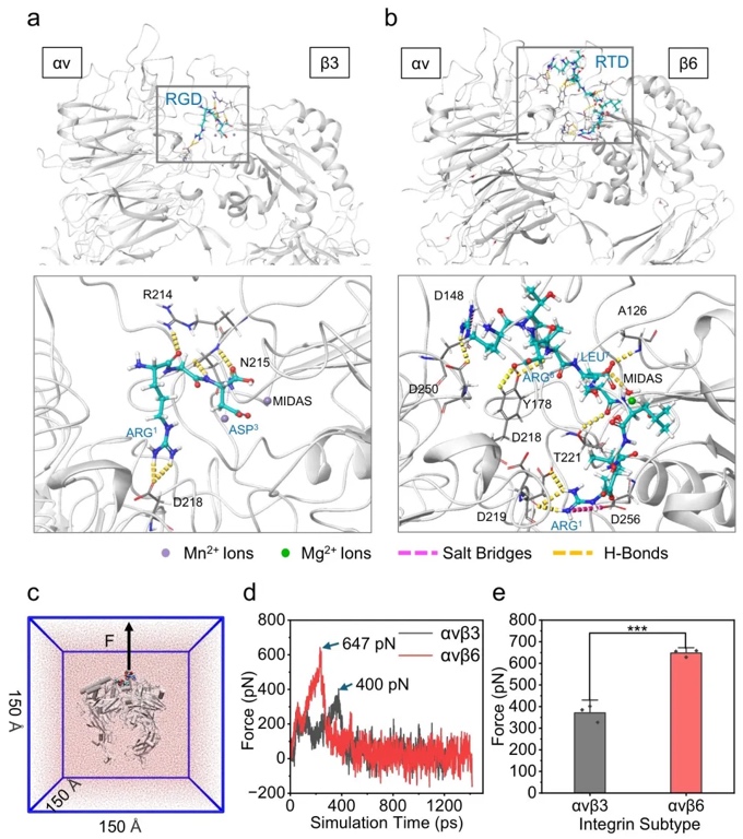 整合素-配体相互作用及力诱导解离动力学的计算分析图,通过分子对接和分子动力学模拟的方法,研究了RGD与αvβ3、RTD与αvβ6的相互作用及力诱导解离动力学。结果显示,RTD与αvβ6的结合亲和力高于RGD与αvβ3,且RTD从αvβ6解离所需的断裂力(647