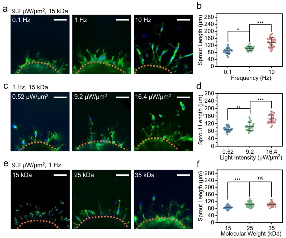 3D水凝胶中细胞迁移的影响图,通过实验观察与数据分析的方法,研究了机械刺激对卵巢癌Hey细胞迁移的影响。结果表明,光热诱导的大分子致动器收缩产生的拉力可显著促进Hey细胞的间充质集体迁移,增加细胞迁移距离,且较高的驱动频率和激光功率密度会增强机械刺激效率,促进细胞迁移。