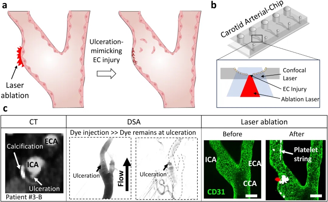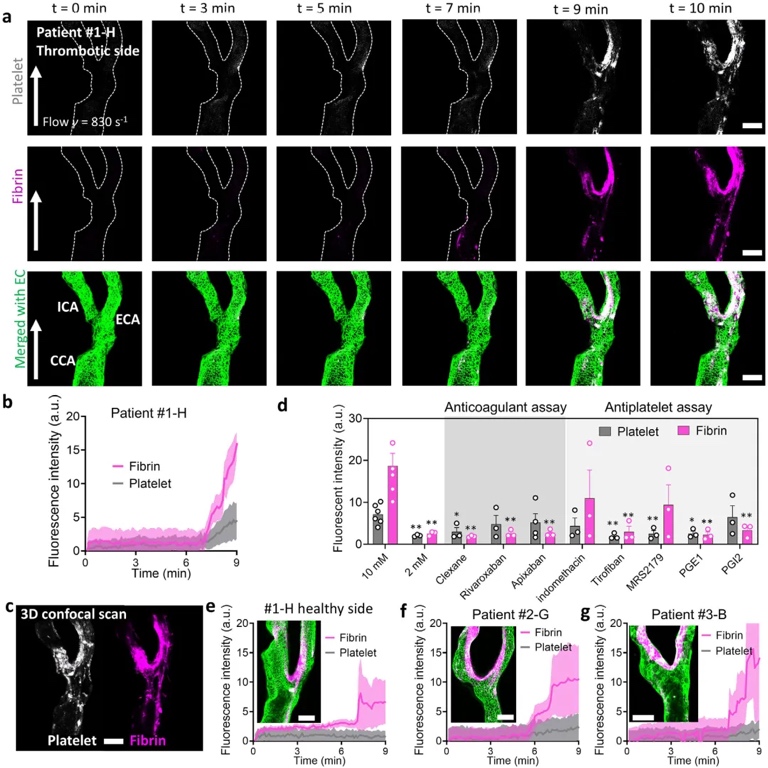 玻璃基底三维微制造技术:仅用两小时,就能把卒中患者的影像数据“复刻”为解剖学精确的颈动脉芯片模型。这个微型装置可再现患者独有的血管几何与流场,在可控损伤下实时成像血栓形成全过程。这一路线为患者特异的器官芯片带来重大突破,将加速个体化医疗与血管介入器械的研发与转化。