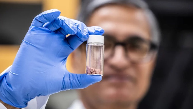 △MansoorKhan 博士展示新近 3D 打印的药丸。图片来自德克萨斯A&M 大学。