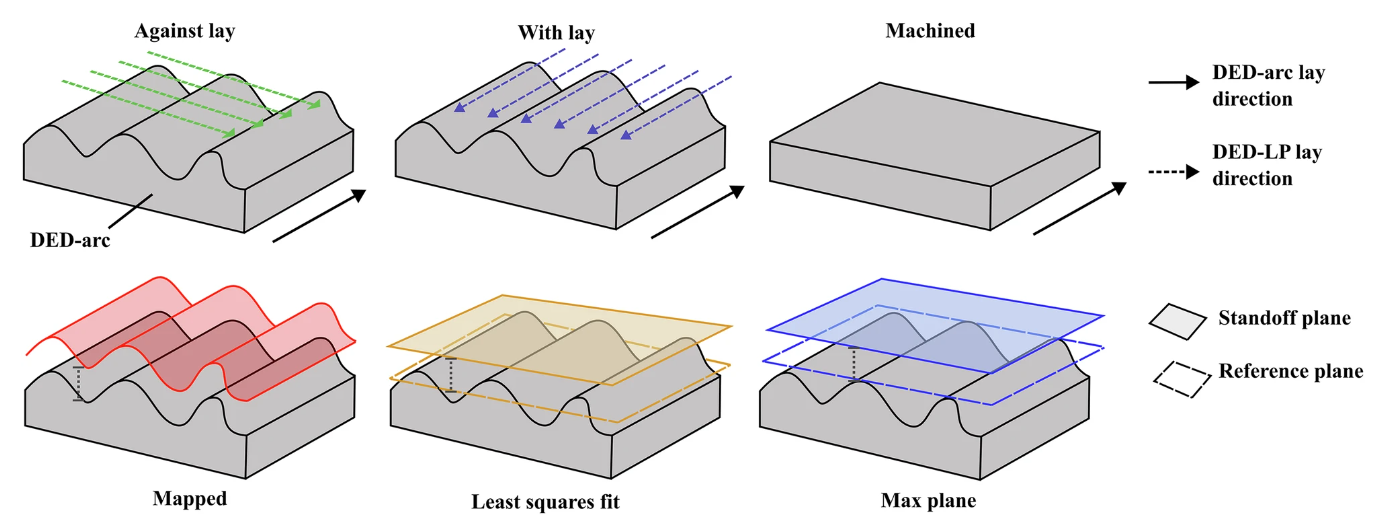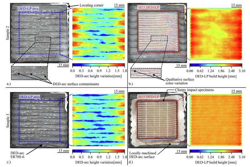 论文评估了七种样品配置,发现虽然加工表面可以提高密度,但打印界面有时在韧性方面表现得同样出色甚至更好,这凸显了工业用户面临的权衡取舍。实验将采用电弧 DED(DED-arc)沉积的ER70S-6低碳钢与采用激光粉末 DED(DED-LP)沉积的H13工具钢配对。测试了四种界面策略:将激光隔离平面映射到电弧表面、应用最小二乘最佳拟合平面、选择最大表面高度作为参考以及加工电弧表面。每种策略都与第一层粉末的平行(“同向”)或垂直(“反向”)方向相结合。在这些配置中,与底层