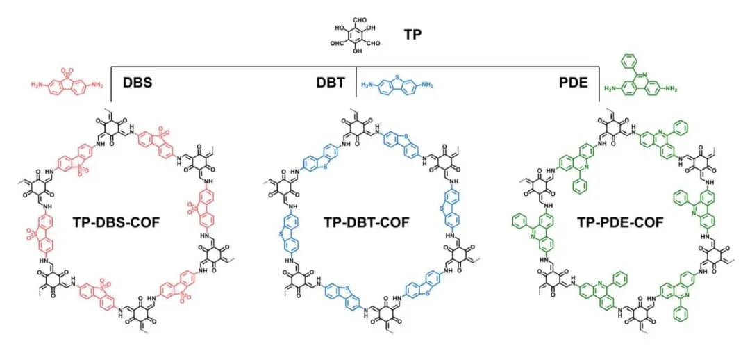 通过展示合成路线和化学结构的方法,研究了TP-DBS-COF、TP-DBT-COF和TP-PDE-COF三种COF的合成过程及结构,结果表明这三种COF可通过席夫缩合反应合成,且具有不同的化学结构。