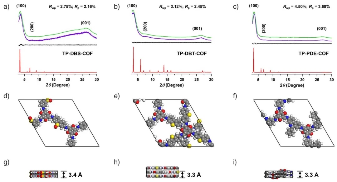 通过粉末X射线衍射(PXRD)、结构模拟等方法,研究了TP-DBS-COF、TP-DBT-COF和TP-PDE-COF的结晶结构和堆积方式,结果表明它们均为高结晶性的2D聚合物,具有不同的空间群、晶胞参数和堆积模式,且存在六边形通道。