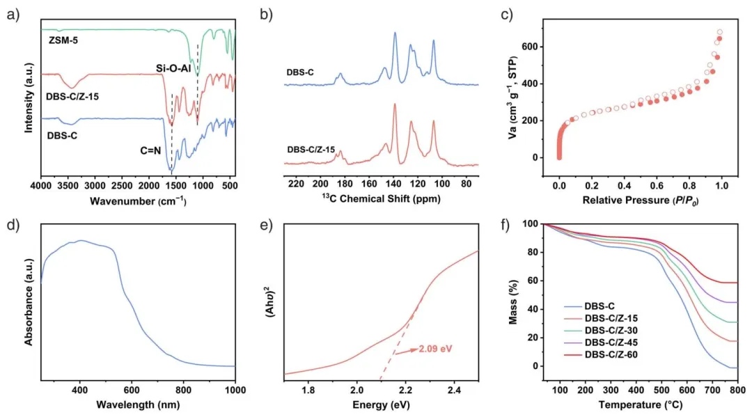 通过红外光谱、核磁共振、氮气吸附-脱附、紫外-可见漫反射光谱、热重分析等方法,研究了TP-DBS-COF/ZSM-5-15%复合材料的结构、光学性能和热稳定性,结果表明复合材料中COF和沸石成功结合,保留了各自的结构特征,且具有较高的比表面积、合适的光学带隙和良好的热稳定性。