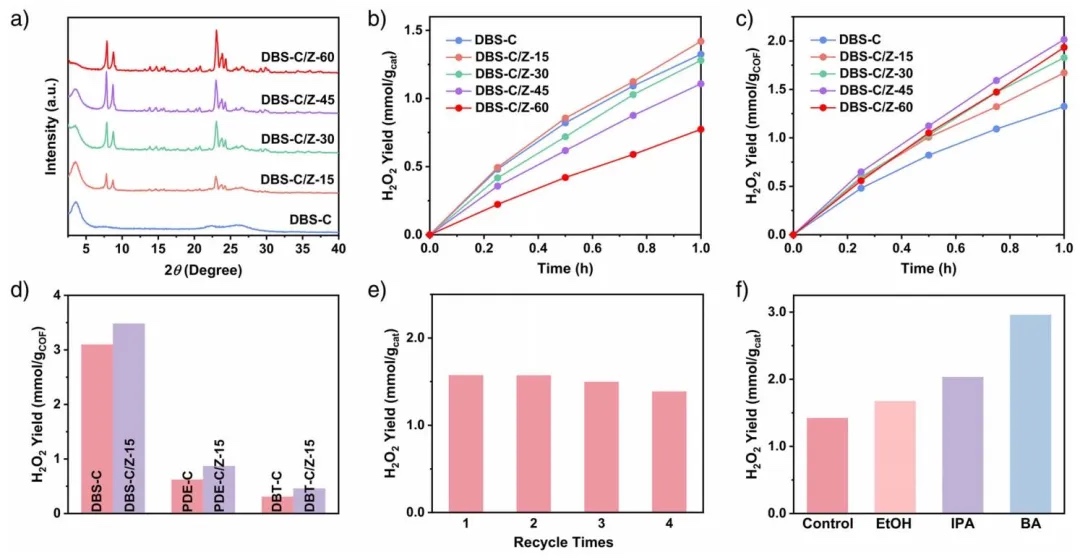 通过X射线衍射、光催化性能测试等方法,研究了不同ZSM-5含量的TP-DBS-COF/ZSM-5复合材料及其他COF/沸石复合材料的结晶性和光催化产H₂O₂性能,结果表明复合材料保持高结晶性,且当ZSM-5含量为15%时部分复合材料光催化活性最高,相比纯COF有显著提升,同时材料具有良好的循环稳定性。