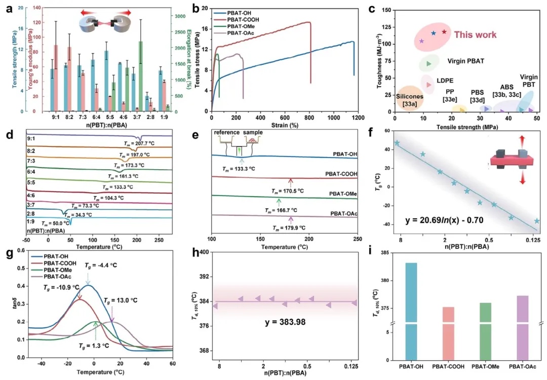 可编程PBAT的机械与热性能表征图,通过拉伸测试、差示扫描量热法(DSC)、动态力学分析(DMA)及热重分析(TGA)的研究方法,研究了不同主链组成(n(PBT):n(PBA))和端基类型PBAT的性能。结果表明,PBAT拉伸强度最高达17.34