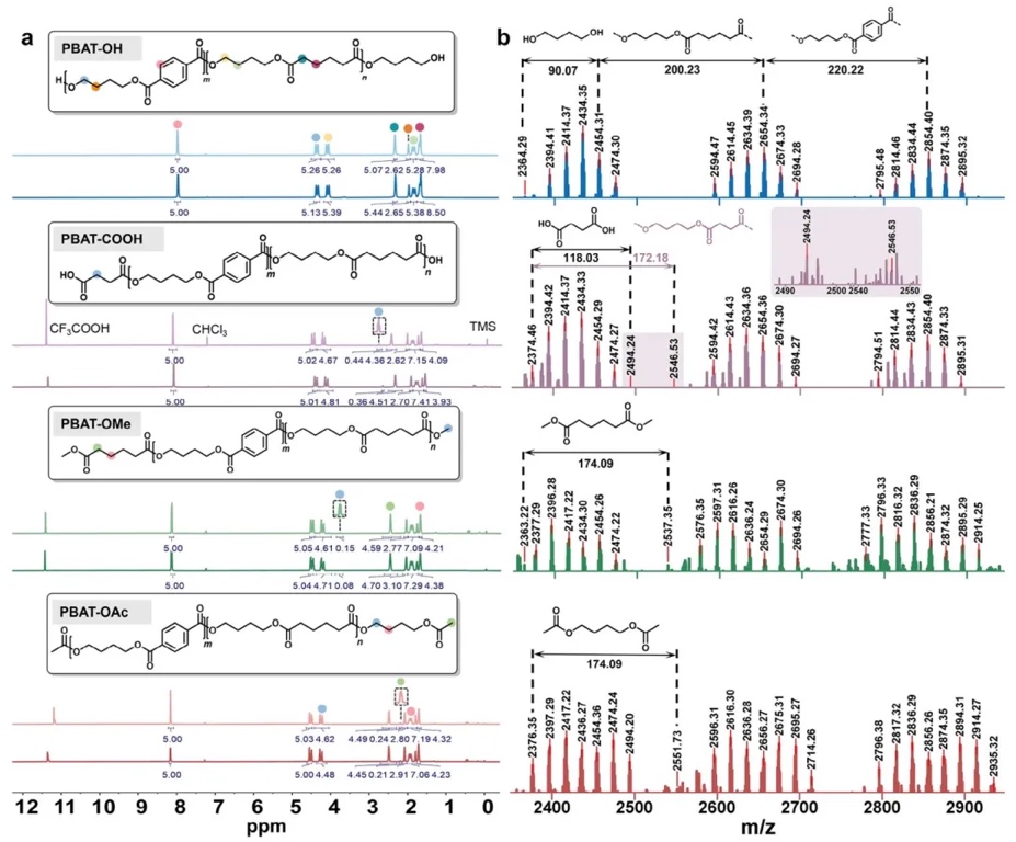 NMR光谱和MALDI-TOF-MS分析的研究方法,研究了PBAT-OH、PBAT-COOH、PBAT-OMe和PBAT-OAc的端基结构。结果显示,PBAT-COOH的羧基端基在2.79