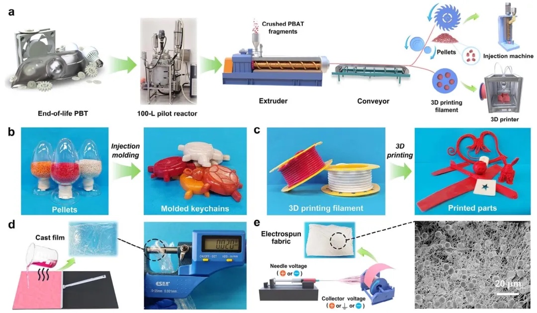 废弃PBT转化PBAT的应用场景示意图,通过挤出造粒、3D打印、溶液成膜及静电纺丝的研究方法,研究了PBAT在注射成型、3D打印、薄膜和纤维领域的应用。结果显示,PBAT可制备0.02