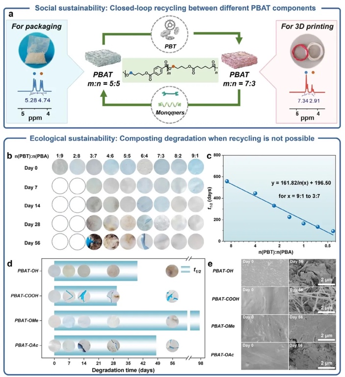 PBAT的社会与生态可持续性评估图,通过模拟堆肥降解实验(58±2℃、55%湿度)及闭环回收验证的研究方法,研究了PBAT的降解动力学与循环可行性。结果表明,PBAT降解半衰期(t1/2)与n(PBT):n(PBA)呈线性相关(t1/2