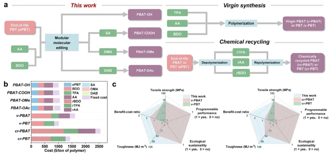 废弃PBT转化为PBAT的技术经济分析图,通过对比原材料成本、固定成本及性能指标的研究方法,研究了自制PBAT与商业原生/化学回收PBAT/PBT的经济性。结果显示,自制PBAT材料成本为802.98–866.82美元/吨,较原生PBAT降低34.0%–38.1%,效益成本比达3.08–3.28(原生PBAT为2.03),拉伸强度和韧性分别超越原生PBAT