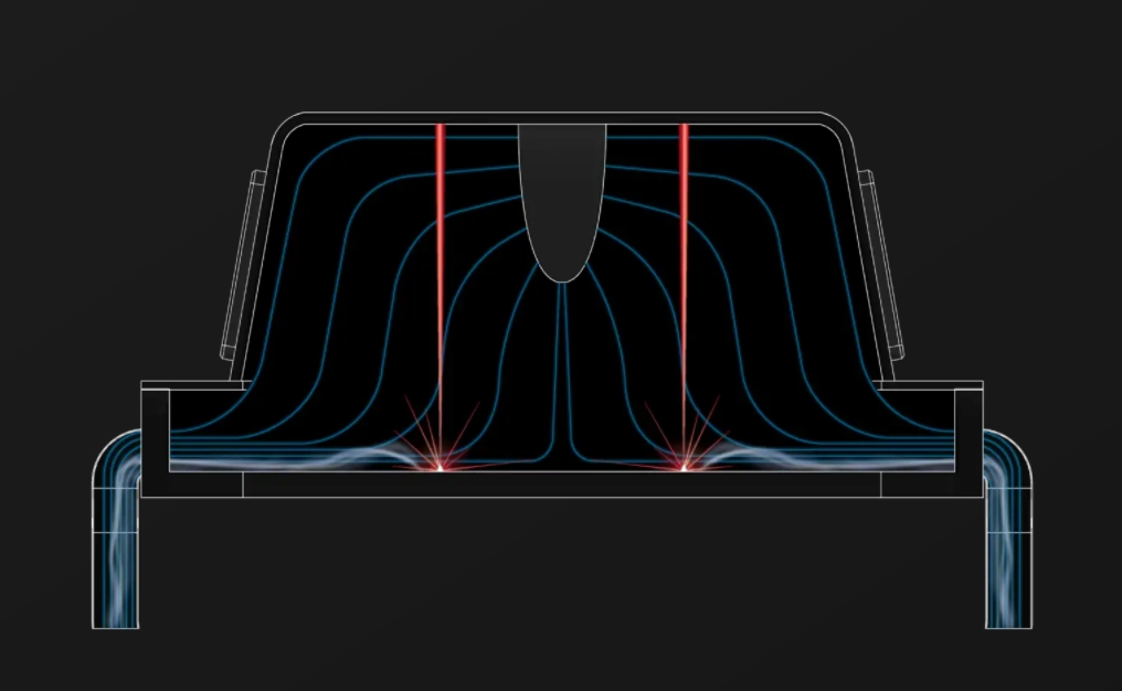 10K等大型LPBF设备中,AirSword能产生覆盖整个打印空间的动态、多层气流。系统中央的气体发射器会沿腔室轴线将气流分为两股反向气流,将烟雾与飞溅物推向两侧的排气口。即便在长时间打印过程中,这一设计也能防止烟雾在腔室内扩散,避免其干扰激光束路径。