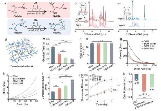 kPa)最匹配。含HepMA组7天HB-EGF释放率(40%)显著低于纯5GM组(80%)。Zeta电位证实HepMA通过静电调控释放。最终选择5GM-0.5HM,满足力学匹配、打印适性和控释三大需求。