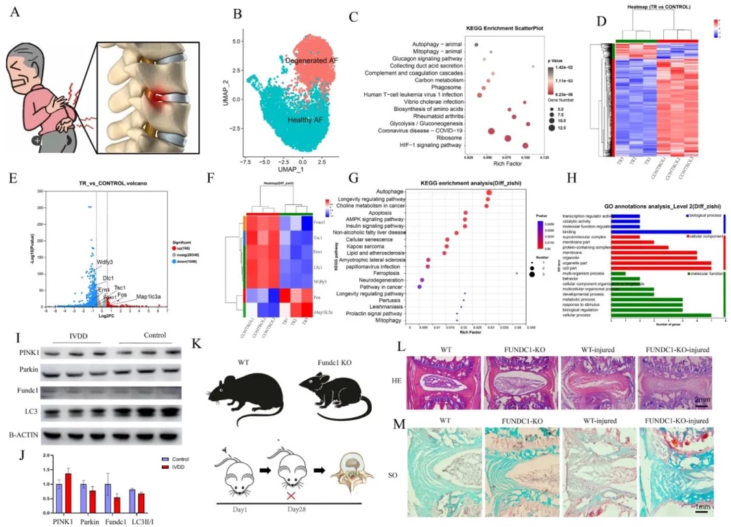 通过分析人类纤维环退变与正常细胞的单细胞RNA-seq数据,用IL-1β诱导大鼠纤维环细胞建立退变模型并检测相关基因和蛋白表达,还构建Fundc1基因敲除小鼠进行尾穿刺实验,研究了线粒体自噬在纤维环退变中的作用,结果表明退变纤维环细胞中线粒体自噬相关蛋白表达异常,线粒体自噬对纤维环有保护作用,其缺失会加剧椎间盘损伤。