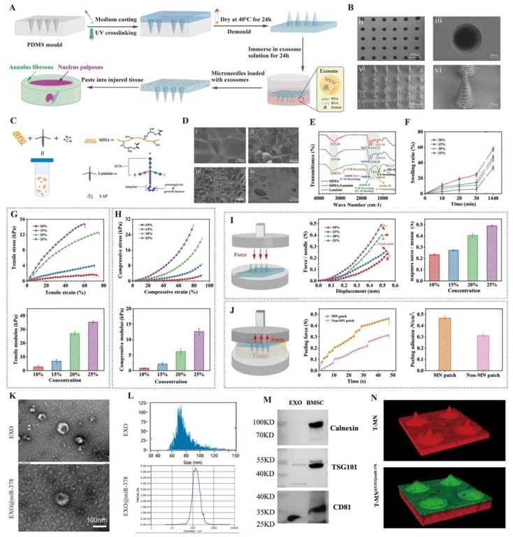 通过3D打印技术制备PDMS模具,以SilMA和层粘连蛋白为材料制备螺纹微针,利用扫描电镜、红外光谱、力学测试等方法,研究了T-MN@EXO@miR−378的制备和性能,结果表明该微针结构能紧密贴合纤维环组织,层粘连蛋白可吸附外泌体并实现缓慢释放。