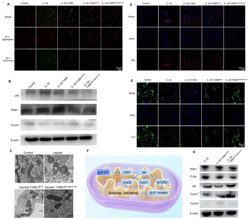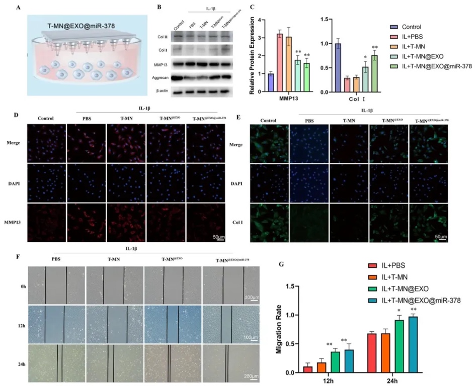 通过将纤维环细胞与T-MN、T-MN@EXO、T-MN@EXO@miR−378共培养,检测MMP13和Col I表达并进行细胞迁移实验,研究了该系统对细胞外基质代谢和细胞迁移的影响,结果表明其能抑制MMP13表达、促进Col I合成并促进纤维环细胞迁移。