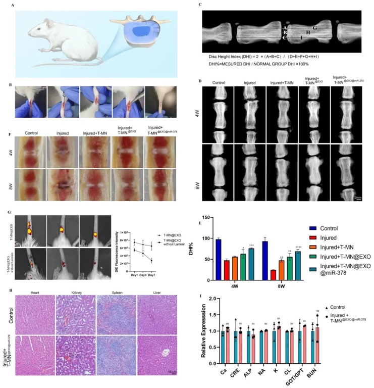 通过建立大鼠纤维环损伤模型,进行X-ray和MRI检测、组织染色及免疫组化分析,研究了T-MN@EXO@miR−378的体内治疗效果,结果表明其能维持椎间盘高度和形态、可持续释放外泌体且无明显全身毒性。