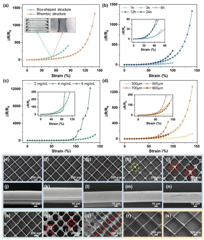 GO浓度和500μm纤维间距时,传感器在140%应变下GF达3807.8,而处理24小时或GO浓度6mg/mL会导致性能下降。